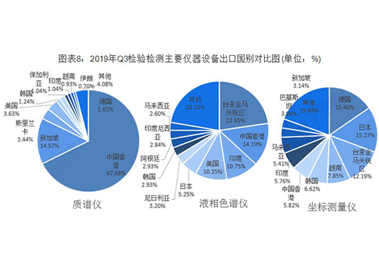 出口方面,2019年前三季度,質(zhì)譜儀主要向中國香港出口,占比達到67.68%,超過一半比重。液相色譜儀主要向臺澎金馬關(guān)稅區(qū)、中國香港、印度出口,出口占比分別達到22.65%、14.19%和10.75%。坐標儀主要向德國和日本出口,出口占比達到15.4%和15.27%。
