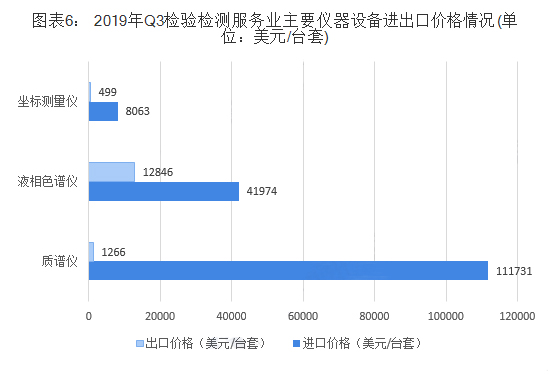 從價格來看,進口質(zhì)譜儀平均價格約為111731美元/臺,進口液相色譜儀平均價格約為41974美元/臺,進口坐標測量儀平均價格約為8063美元/臺,均遠超過出口平均價格。