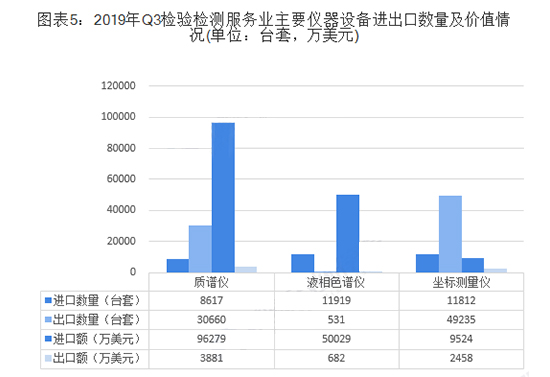 2019年前三季度,我國高端檢驗檢測設(shè)備以進口為主,質(zhì)譜儀、液相色譜儀進口金額分別達到96279萬美元和50029萬美元,分別為出口金額的25倍和73倍,差距較大。