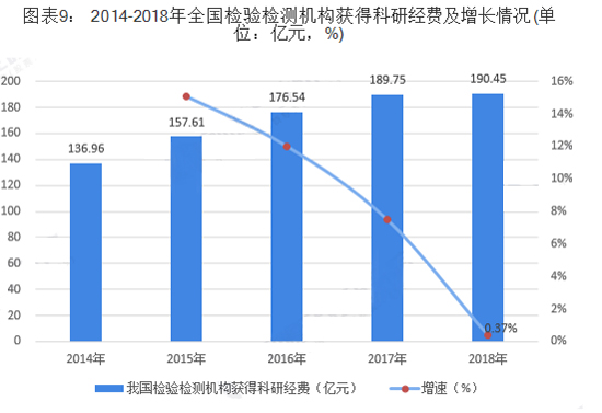 2014-2018年,我國檢驗檢測機構(gòu)獲得科研經(jīng)費呈不斷上升趨勢,但是增速呈不斷下降趨勢,且下降速度較快。2018年全國檢驗檢測機構(gòu)獲得科研經(jīng)費為190.45億元,同比增長僅0.37%。