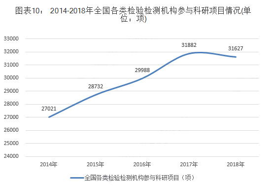 2018 年,全國各類檢驗檢測機構(gòu)參與科研項目總計31627 項,比去年減少255 項,一定程度上受到儀器設(shè)備的影響??蒲许椖康陌l(fā)展與我國檢驗檢測設(shè)備的發(fā)展息息相關(guān),未來我國應(yīng)進一步加強自身設(shè)備的研發(fā)制造,提高科研力度,從而推動科研項目發(fā)展。
