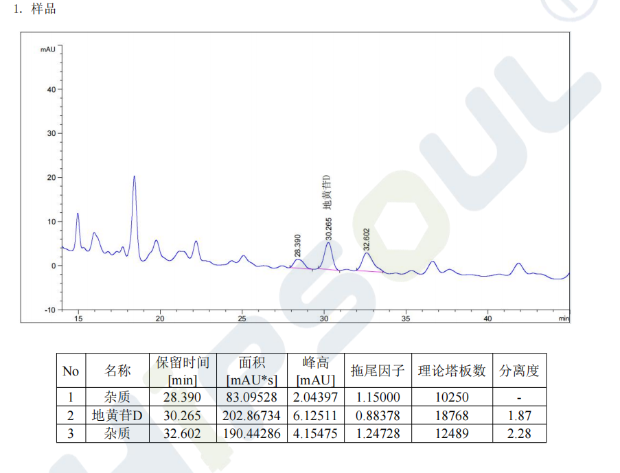 ?? 地黃苷 D 分離檢測(cè):依托 USHD C18-AR 5μm, 120?,4.6mm×250mm 色譜柱,以甲醇 / 0.1% 磷酸為流動(dòng)相,實(shí)現(xiàn)地黃苷 D 與雜質(zhì)的基線分離,拖尾因子理想,完全滿足中國(guó)藥典檢測(cè)標(biāo)準(zhǔn),為中藥有效成分分析保駕護(hù)航。