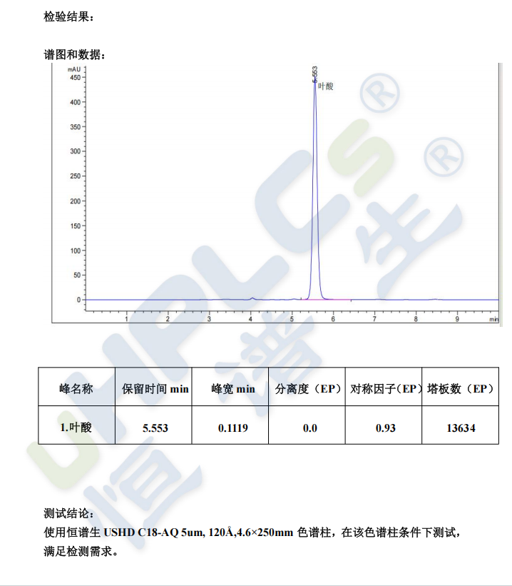 葉酸檢測專用分析柱4.6*250mm粒徑5μm孔徑120?